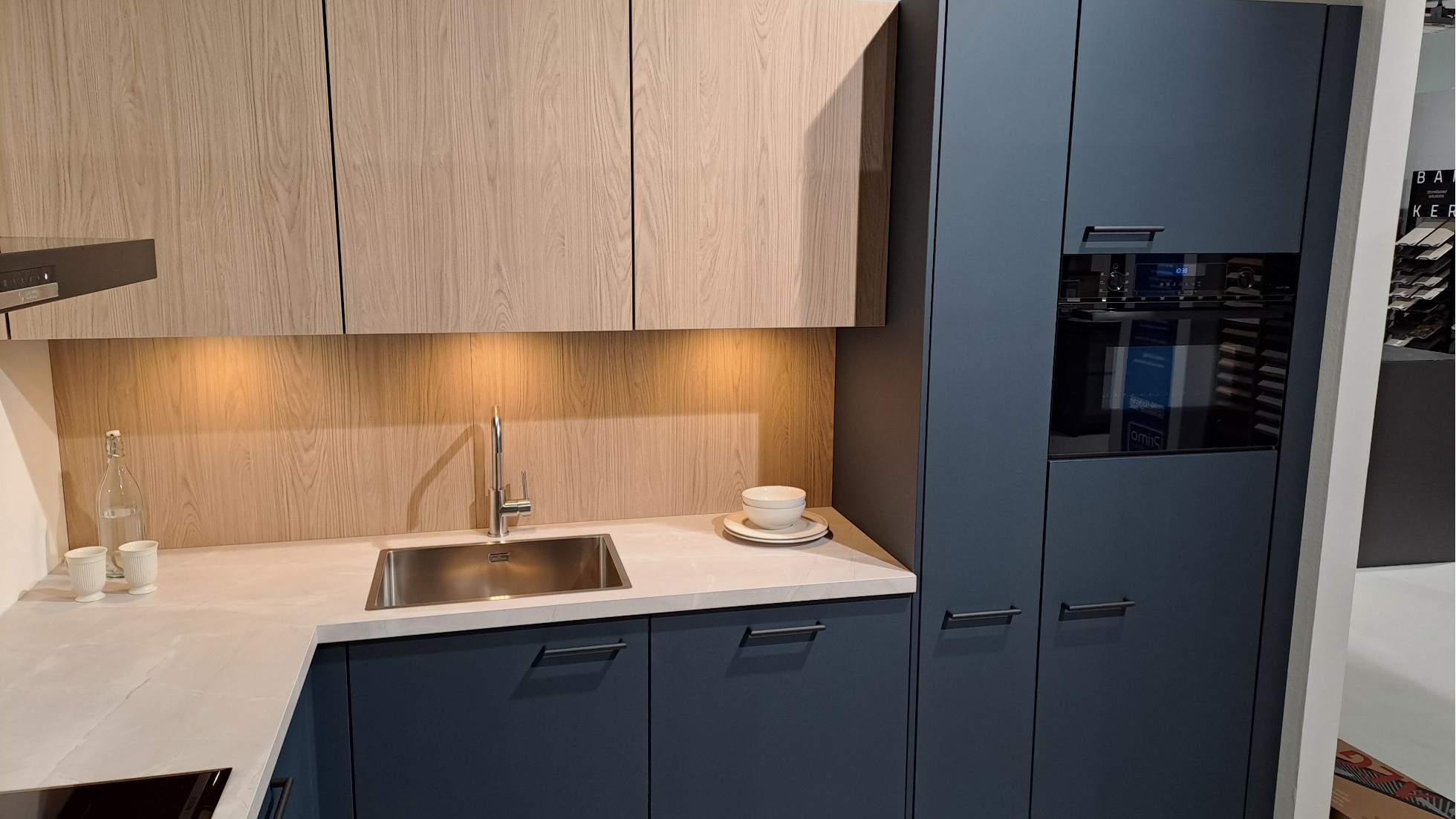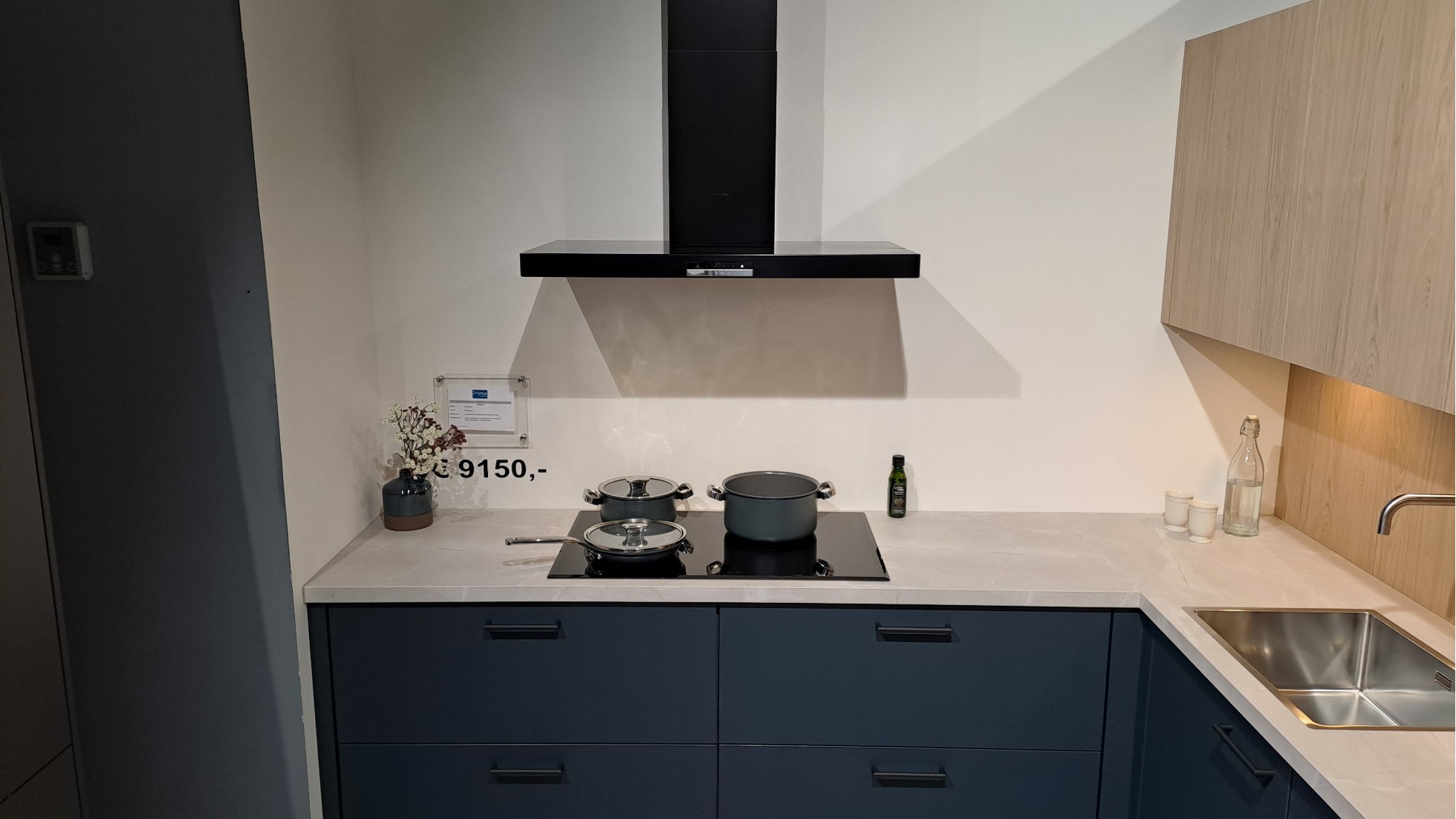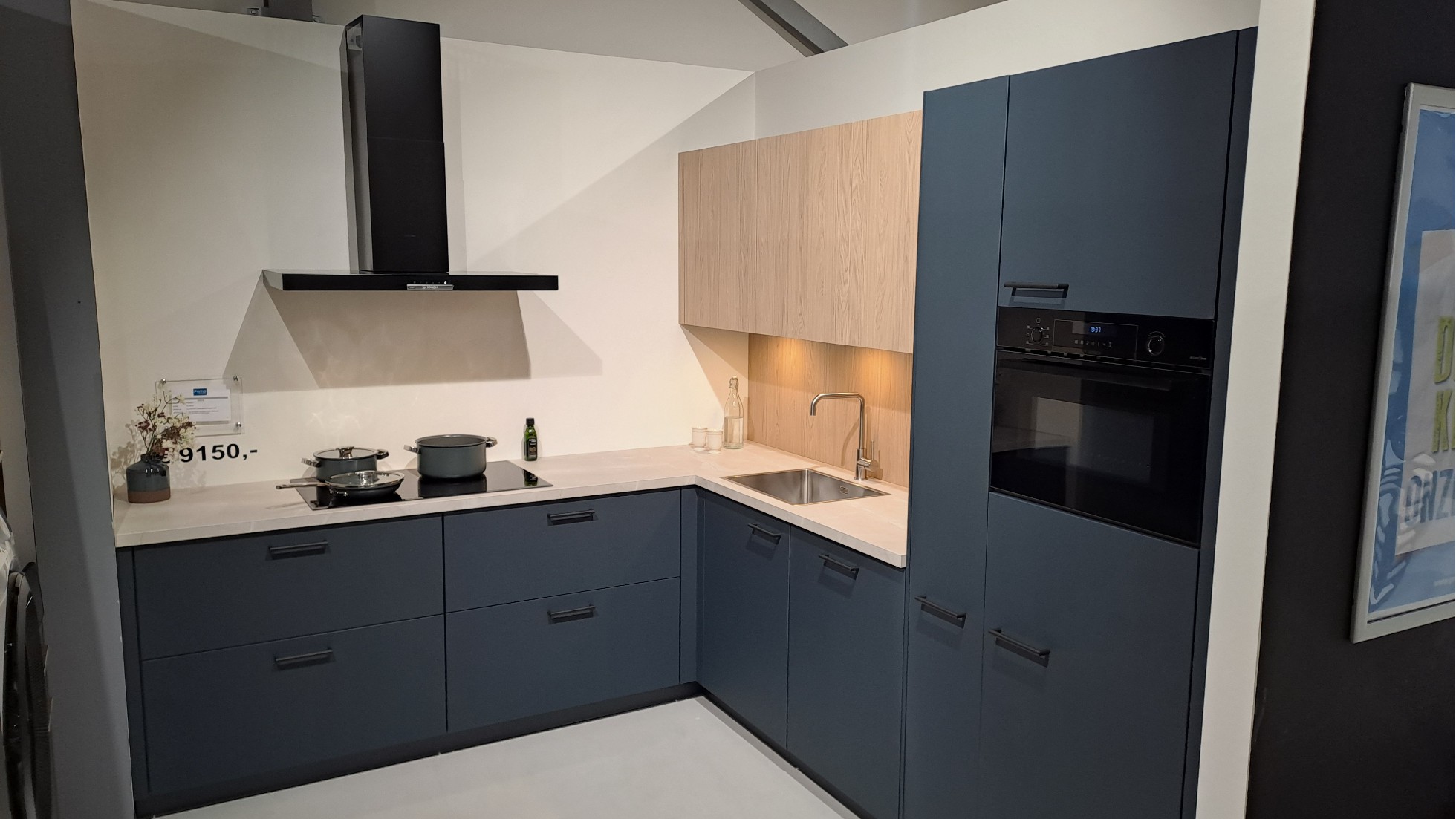Deze specifieke keuken is uitgevoerd in een laklaminaat in de kleur fjordblauw ultramat. Dankzij de innovatieve anti-fingerprintcoating hebben de fronten uitstekende onderhoudseigenschappen en ziet het er ook nog eens prachtig uit. Het kunststof werkblad is uitgeoverd in Decor Marmer Kaspisch grijs wat een prachtige aanvulling op de keukenkleur is.