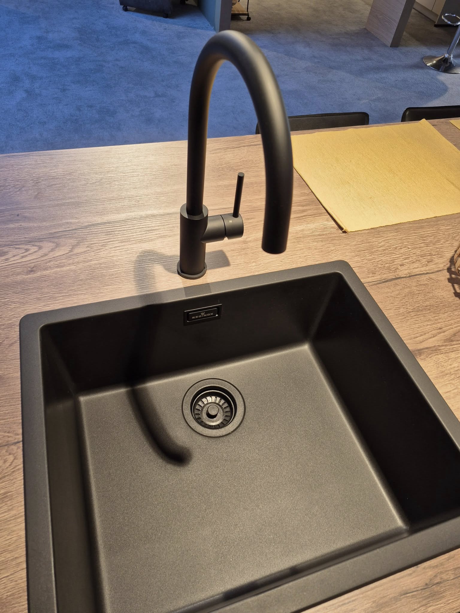 De keuken wordt tevens incl. zwarte spoelbak en bijpassende kraan verkocht (krukken niet inbegrepen in de prijs).