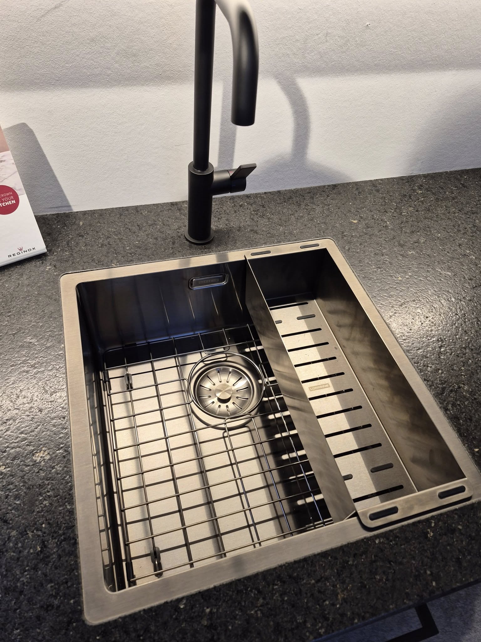 Het werkblad van graniet (kleur San Gabriel met suéde afwerking) heeft een ingefreesde gunmetal spoelbak met bijpassende kraan.