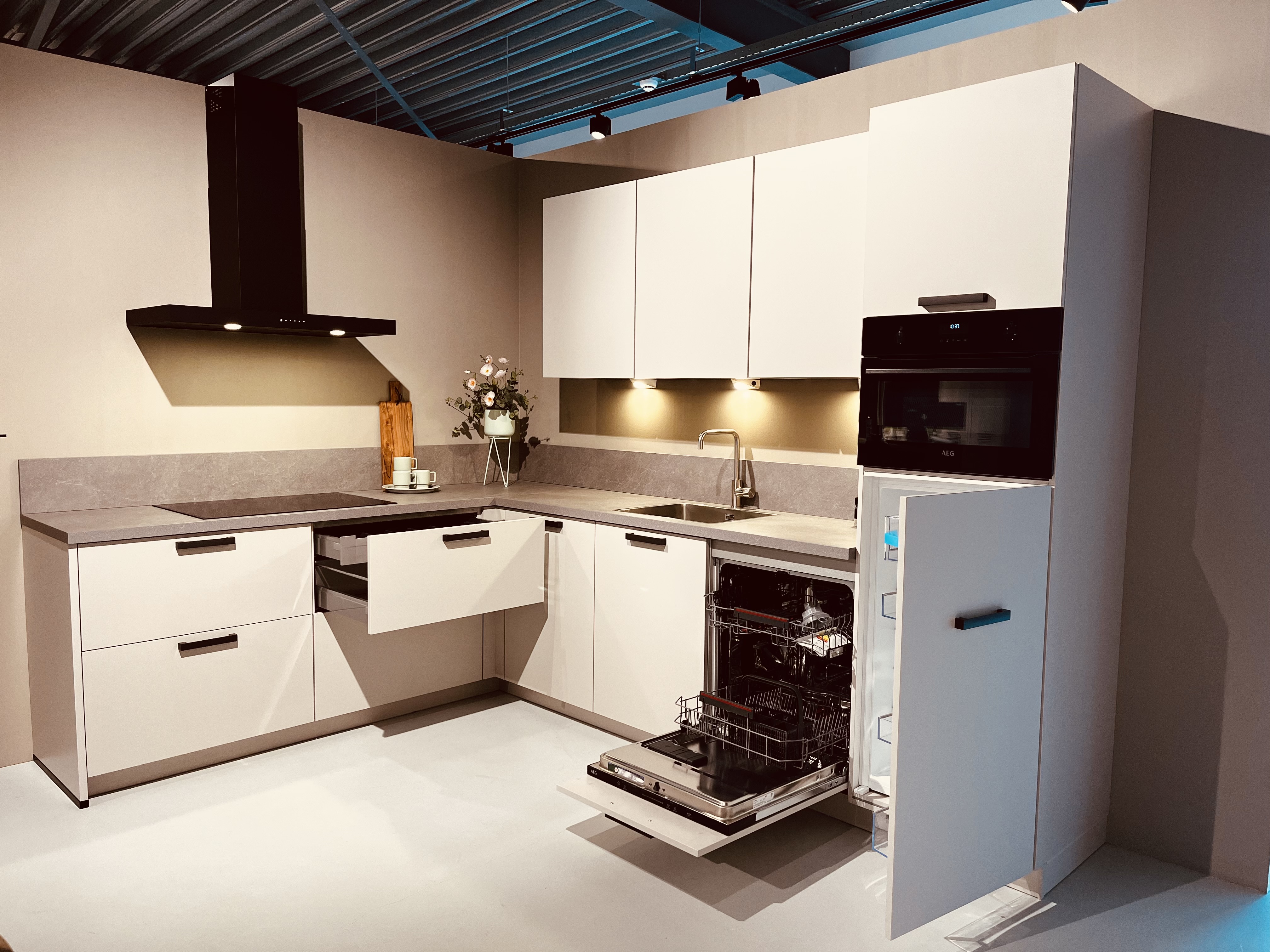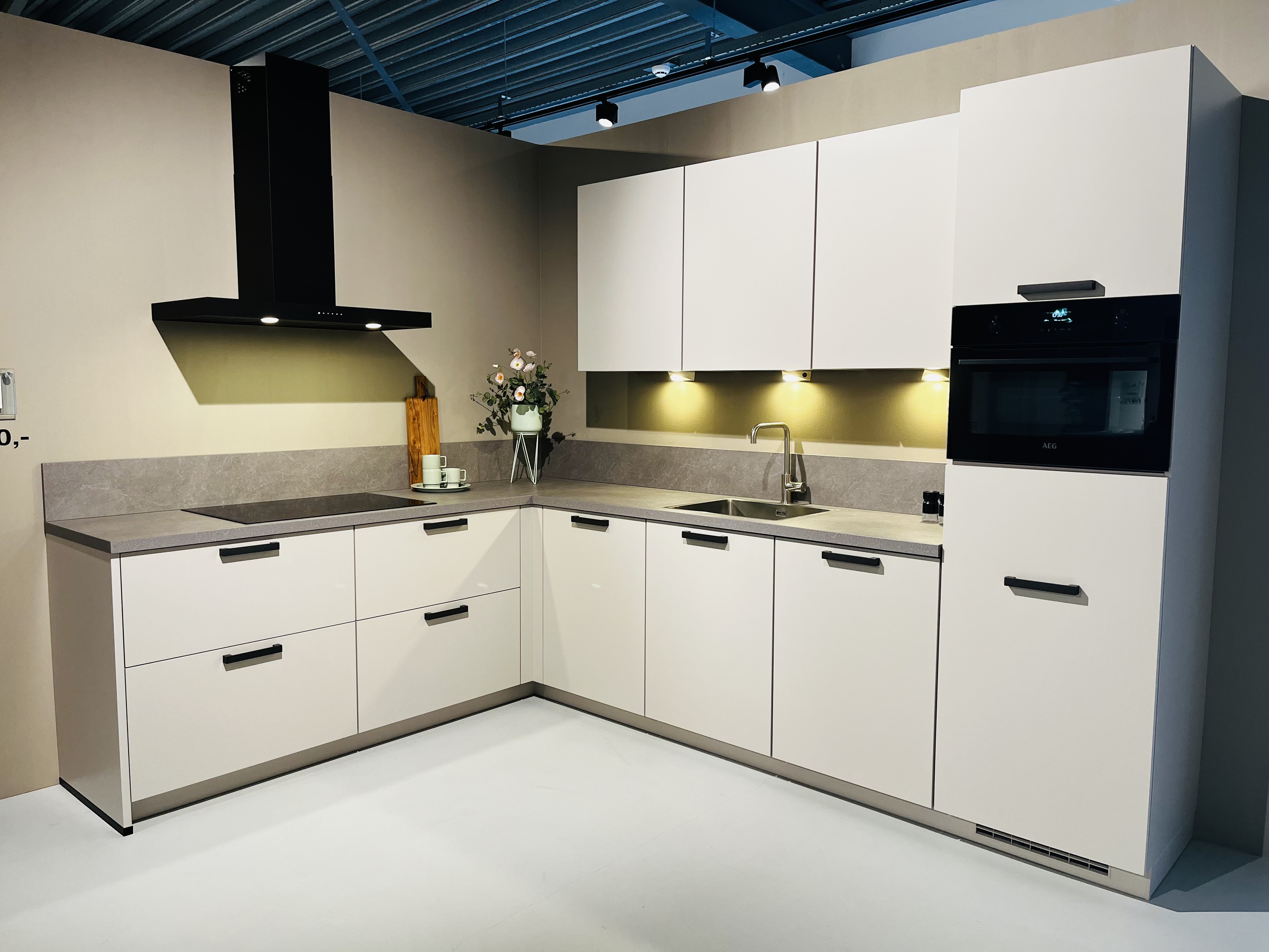 Showroomkeuken | Assen | zandkleurige hoekkeuken met AEG apparatuur