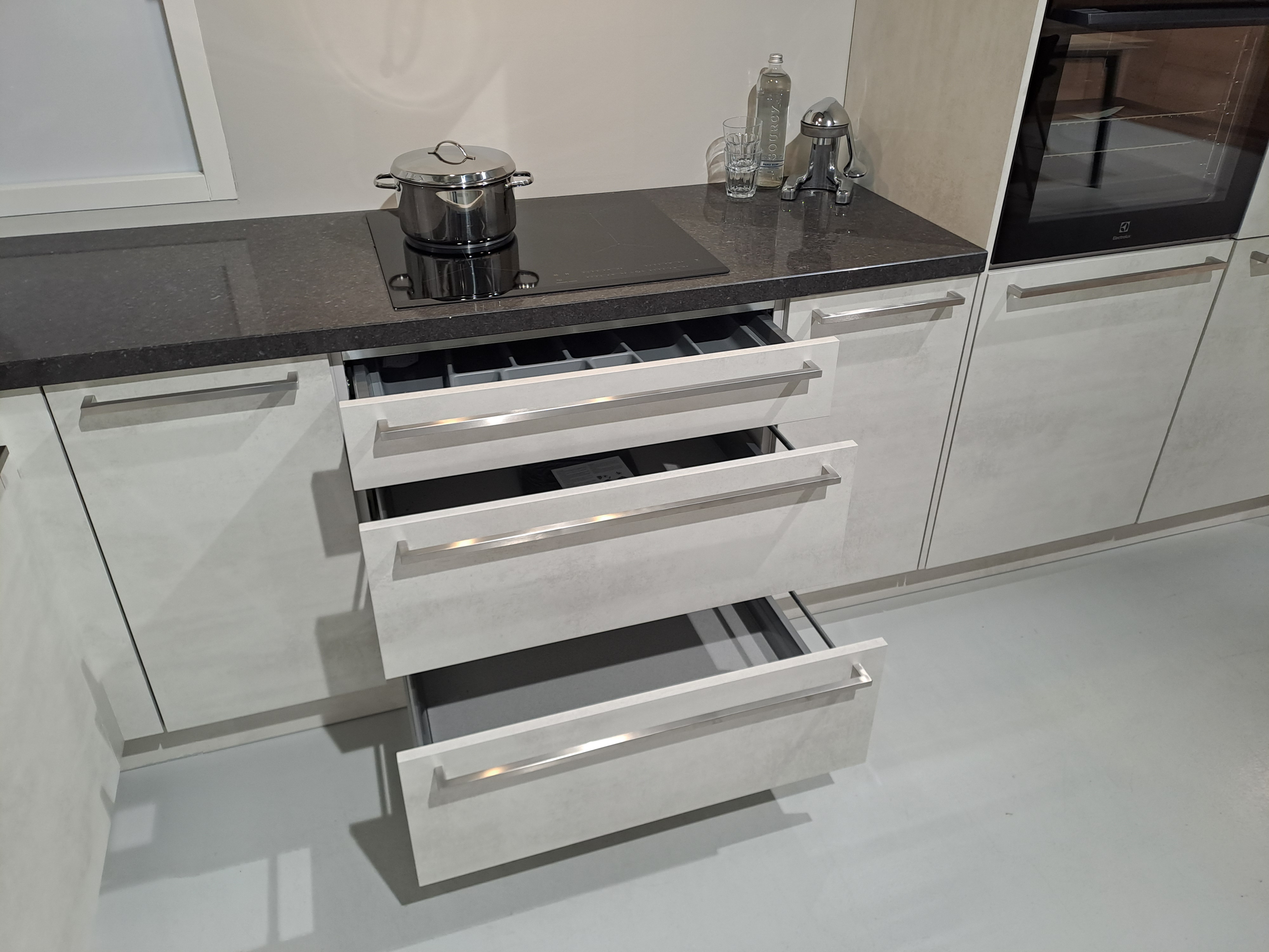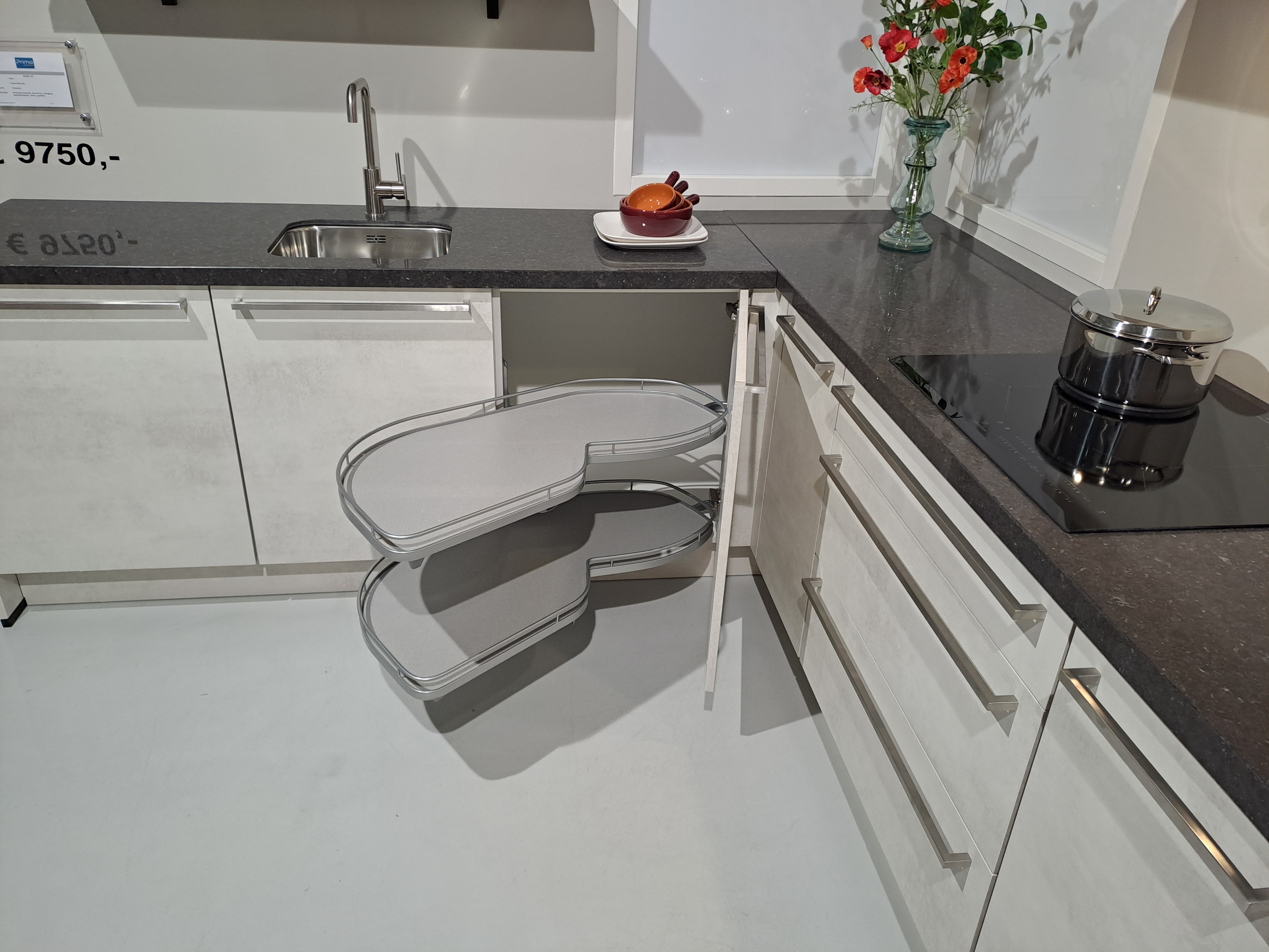 De keuken heeft een afmeting van 2471 x 3500 mm en is voorzien van design-handgrepen en een bijzondere hoekonderkast. Deze heeft speciale uittrekbare plateaus.