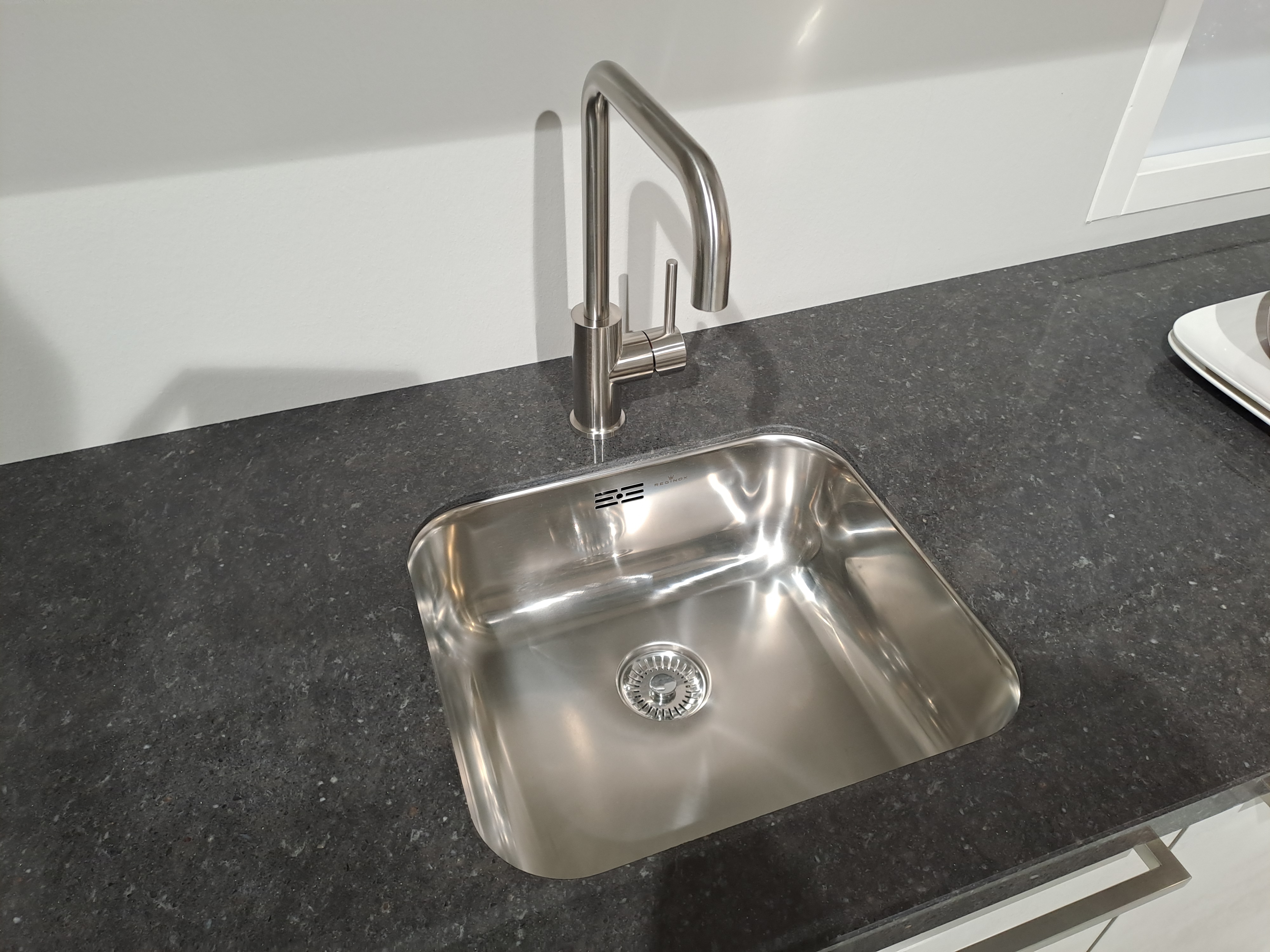 Het werkblad is van composiet met een onderbouw rvs-spoelbak.