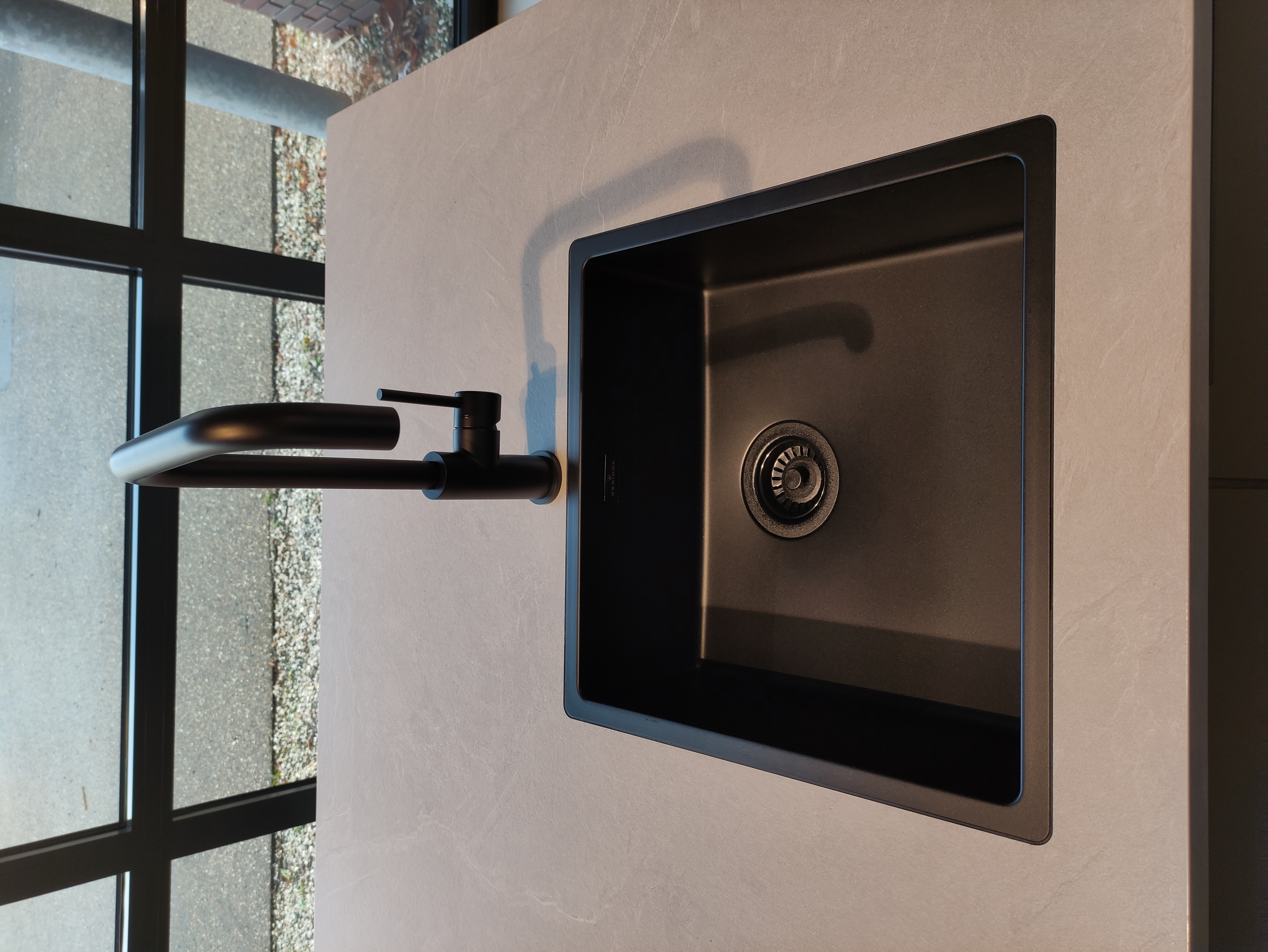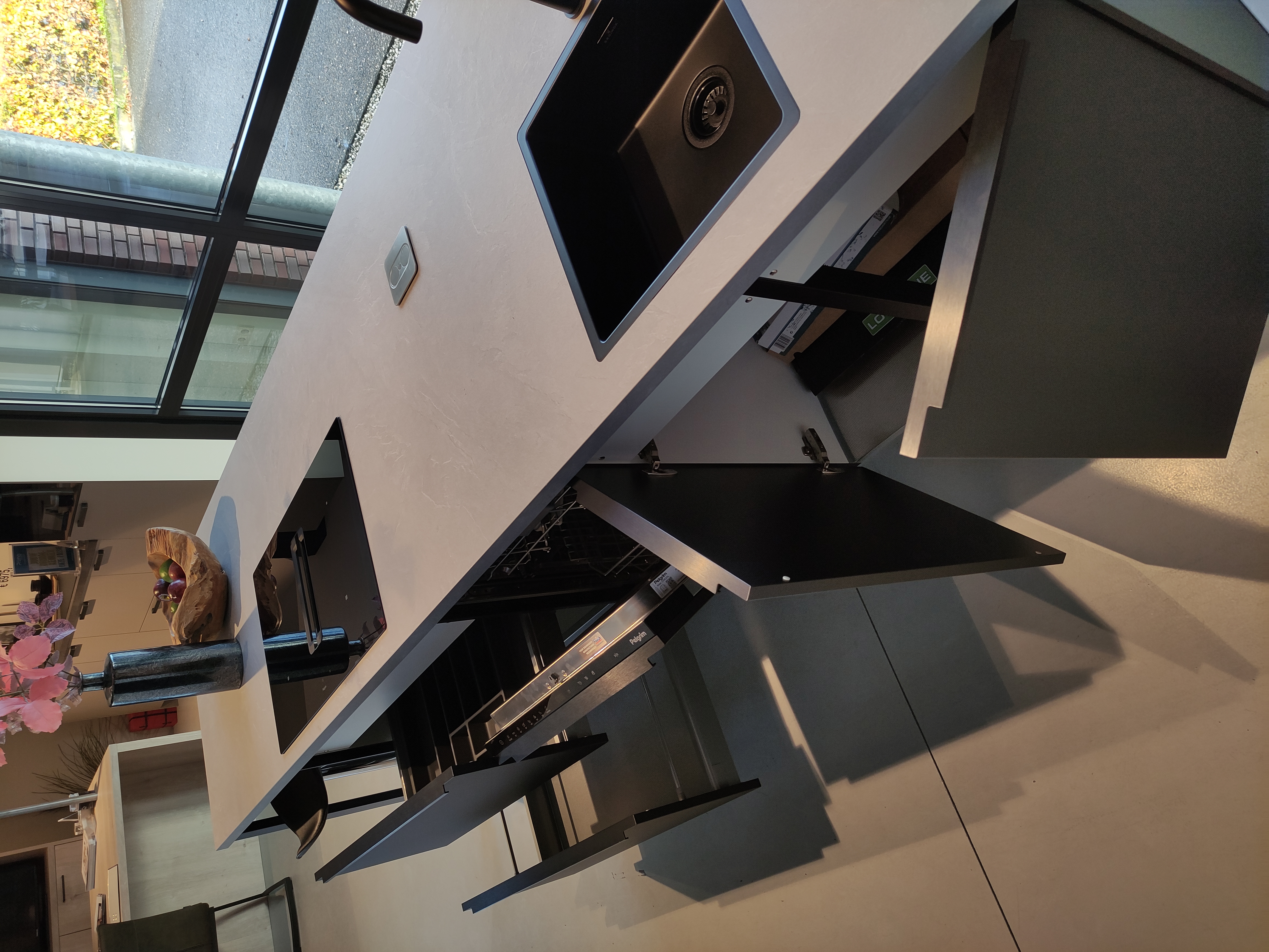 De eilandkeuken is uitgevoerd in de kleur grafietzwart en heeft een werkblad in de kleur Decor Schiefer Steengrijs.